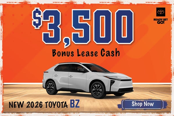 Cash from Southeast Toyota, on the lease of a new 2026 bZ from participating dealer's stock and subject to vehicle availability. Must lease through your dealer and Southeast Toyota Finance to qualify for cash and cash must be applied as capitalized cost reduction on lease. There is no cash back option. Lease terms on approved credit. Not all customers qualify. Offer cannot be combined with SETF Finance Cash, Down Payment Assistance, Trade-in Assistance, Customer Cash, APR, Finance Subvention Cash, Lease Subvention Cash. Offer available in AL, FL, GA, NC, SC regardless of buyer's residency; void where prohibited.See your participating Toyota dealer for details.Offers are plus tax, tag, title, license, registration, and Georgia Lemon Law fee. Dealer does not charge a dealer fee. Lessee responsible for maintenance, excess wear and use, and will pay $0.18 per mile for all mileage over 12,000 miles per year. $350 disposition fee due at lease end. Offer ends 3/31/26.