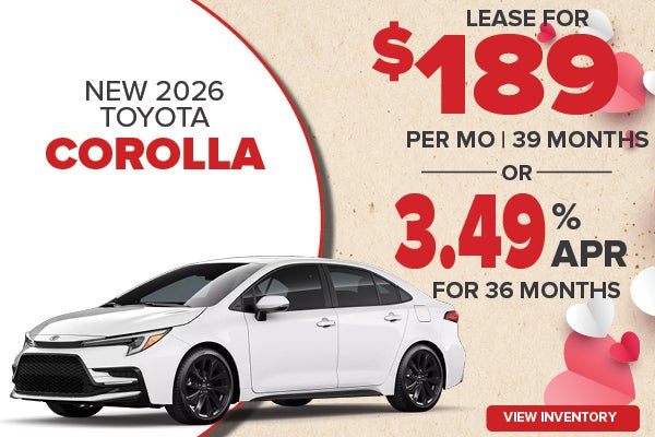 Must be financed or leased through Southeast Toyota Finance (SETF). Qualified customers who finance a new 2026 Toyota Corolla can receive 3.49% APR for 36 months with monthly payments of $29.30 per $1,000 financed. Terms available on approved credit through SETF. Must finance through SETF. Down payment will vary. Qualified lessees can lease a new 2026 Corolla LE, model #1852, for $189 per month for 39 months with $4188 due at signing. Based on 12,000 miles per year. Security deposit required with exception of prior SETF financing history and/or SETF credit rating in which a security deposit may be waived. Offers are plus tax, tag, title, license, registration, and Georgia Lemon Law fee. Dealer does not charge a dealer fee. Lessee responsible for maintenance, excess wear and use, and will pay $0.18 per mile for all mileage over 12,000 miles per year. $350 disposition fee due at lease end. Offer ends 03/02/2026.